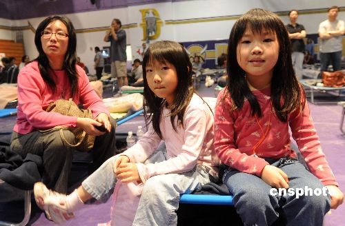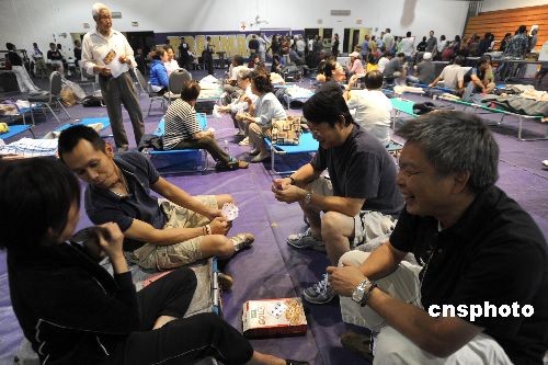 洛杉矶县钻石吧市被迫紧急撤离的华裔居民正在庇护所内打扑克牌。中新社发 张炜 摄