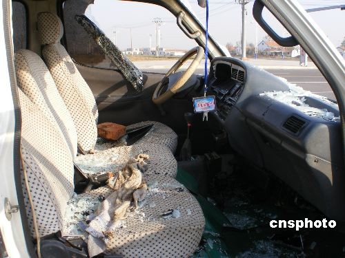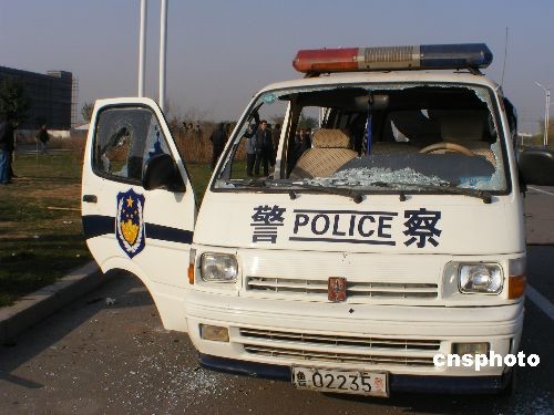 被盗油分子砸烂的警车。 中新社发 唐剑梁效 摄