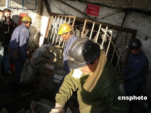 图为救援人员用沙袋将事故矿井封住。 中新社发 侯伟胜 摄