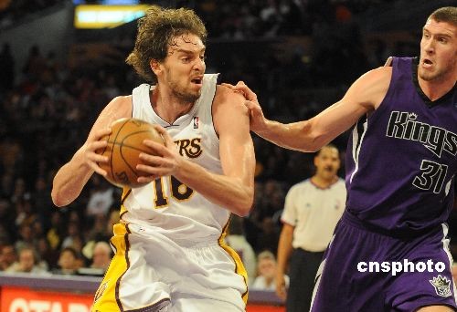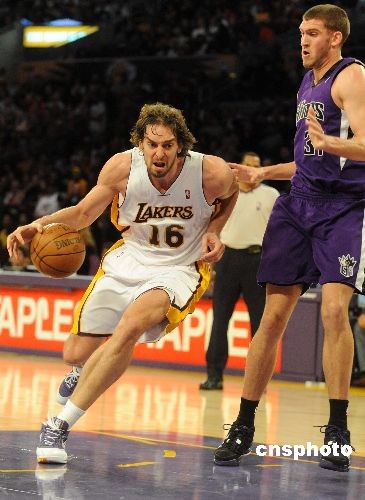 湖人队中锋加索尔全场得16分。中新社发 张炜 摄