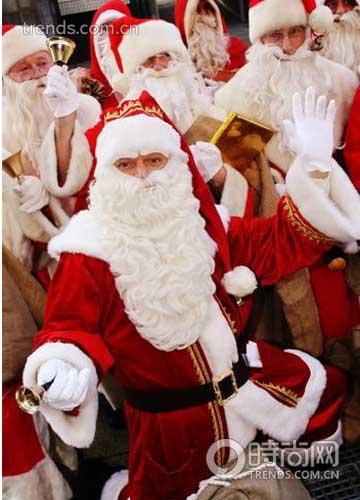 2008年11月22日,在德国北部城市汉堡,人们化装成圣诞老人聚集在一家职业介绍中心前。这家中心从失业者、学生以及其他希望兼职的人中招募了60名临时圣诞老人。被招募者需自己准备服装,表演2小时的报酬约为100欧元。目前,他们已经接到大约200场活动的邀请,预计圣诞节前的活动场次可达到600场。