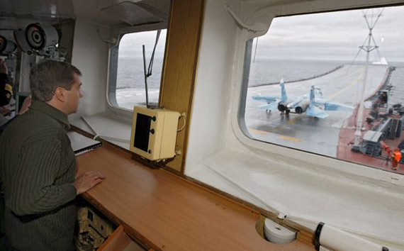 俄总统梅德韦杰夫在库兹涅佐夫号航母上观看稳定2008军演(资料图)