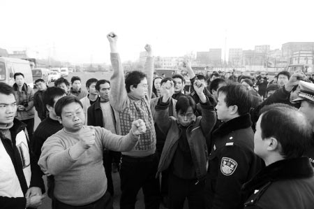 双方发生第二次撕扯。眼看两名劝解的民警被淹没在人群中,立即过来五六名民警才将双方隔开。