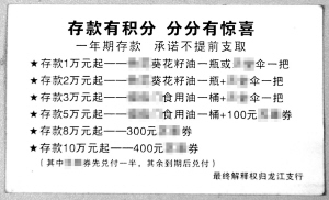 这家银行甚至还给了张婕“客户服务卡”和“回执”作凭证。回执上写着“本人自愿参加某某银行龙江支行储蓄积分活动,到期兑换200积分。”而“积分”指什么?记者看到,印着该行LOGO的“客户服务卡”上注明:存款5万元起——某品牌食用油一桶+100元购物券;存款8万元起——300元购物券;存款10万元起——400元购物券。且注明“其中购物券先兑付一半,其余到期后兑付”(见图)。