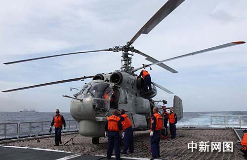 图为“海口”号导弹驱逐舰舰载直升机进行飞行训练准备。中新社记者 孙自法 摄