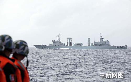 图为“海口”号导弹驱逐舰随舰特战队员在航行途中远眺“微山湖”号综合补给舰。 中新社记者 孙自法 摄