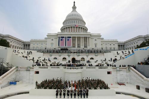 按照典礼程序,奥巴马20日就将发表就职演说,阐述未来四年的治国方略和预定目标。随后,他将坐上总统座驾,在宾法凡尼亚大道上接受群众拥戴。目前国会山西侧的就职典礼观礼台已搭建就绪。