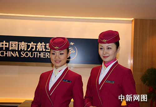 1月15日,大陆南方航空公司在台北正式成立办事处,成为首家在台湾挂牌运营的大陆企业。图为开业揭幕仪式典礼上的南航空姐。中新社记者 陈立宇 摄