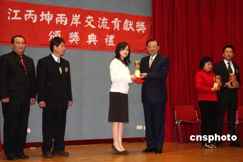 1月15日,海基会董事长江丙坤出席“两岸经贸合作与交流研讨会”,并颁发“江丙坤两岸交流贡献奖”。得主包括台湾大学环境工程学研究所教授骆尚廉、夏潮基金会董事长宋东文等人。中新社发 陈立宇 摄