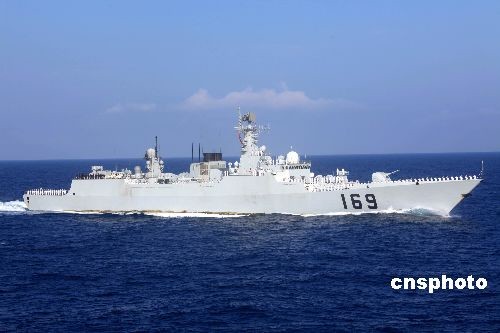 4月26日上午,南中国海阳光明媚,夜间一场大雨为中国海军首批护航编队驶入祖国传统疆域线洗去征尘。首批护航编队在南中国海隆重举行“向祖国报告”仪式。图为“武汉”号导弹驱逐舰护航官兵在甲板上整齐列队,向祖国敬礼。中新社发 孙自法 摄