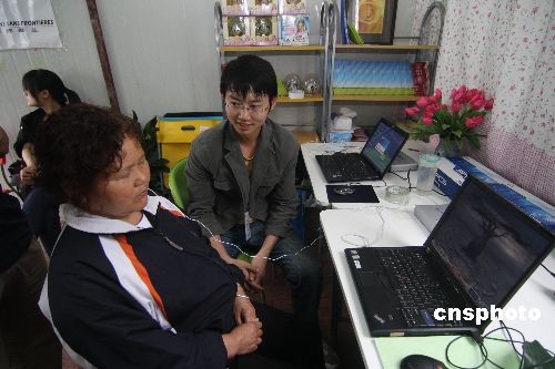 5月7日,在北川县曲山镇永兴板房区,中国科学院心理研究所危机干预中心的工作人员通过“生理相干与自主平衡系统”为北川县老县城的居民提供心理辅导。 中新社发 郭国权 摄