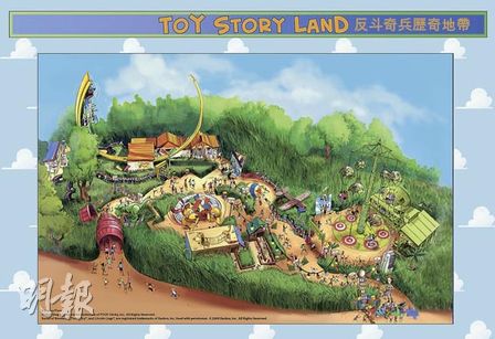 以电影《反斗奇兵3》为骨干,在区内摆放各式超巨型玩具,旅客置身其中,如变了小矮人。区内有3个机动游戏:其一是宾客坐上如“腊肠狗”的设施,经历一段颠簸旅程;另一设施是一台穿梭飞车,接载宾客沿高达数十呎的U形轨道快速来回;最后是一个“跳伞”训练旅程,宾客可因应喜好,调校从25米高台向下急坠的速度。