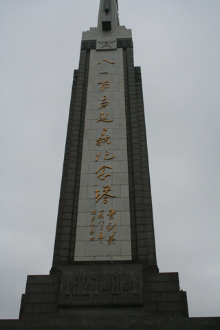 八一南昌起义纪念塔坐落在南昌市区中心的八一广场南端。1977年“八一南昌起义”五十周年时破土兴建,1979年1月8日落成。塔为长方体,总高45.5米。正北面是叶剑英元帅题写的“八一南昌起义纪念塔”九个铜胎鎏金大字,下嵌“八一南昌起义简介”花岗石碑。其他三面是“宣布起义”、“攻打敌营”、“欢呼胜利”三幅大型花岗石浮雕。塔身两侧各有一片翼墙,嵌有青松和万年青环抱的中国工农红军旗徽浮雕。塔顶由直立的花岗石雕“汉阳造”步枪和用红色花岗石拼贴的八一军旗组成。