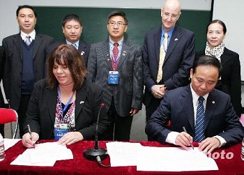 12月7日,美国圣地亚哥河景小学和福州实验小学在福州签订了建立姐妹学校意向书。当日,中美中小学校长座谈会在榕举办,美国33名中小学代表与福州近20所中小学校长及教师代表进行了广泛深入的交流,共同探讨汉语教学与中国文化交流以及在美国中小学开设孔子课堂及派遣赴美汉语教学志愿者等项目合作意向。(中新社/张丽君 摄)