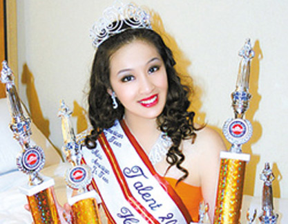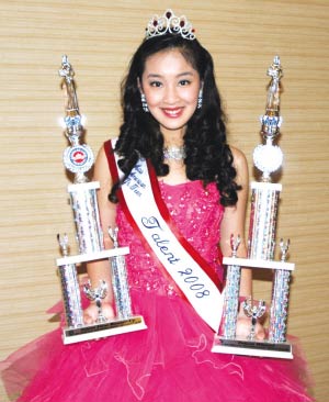 崔晴晴2005年开始参加美国妙龄小姐加州选拔赛,连续四年代表加州与全国妙龄小姐同台竞技,去年更以加州妙龄小姐皇后身份成为全国杂志封面女孩。今年,崔晴晴再度以钢琴演奏贝多芬“月光奏鸣曲”第三乐章和芭蕾表演“银色瀑布”技压群芳,让评委破例将冠、亚军两座奖杯全部收入囊中。不仅如此,父母均来自北京的崔晴晴,钢琴、芭蕾、模特、小品和跆拳道无不精通。