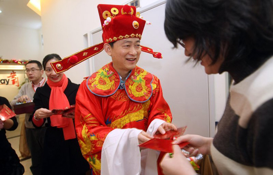 2010年2月22日,当日是杭州不少公司企业新年上班的第一天,杭州文晖路上一家公司的老总扮成财神模样,为按时上班的员工派发红包,鼓励员工虎年事业蒸蒸日上,财源广进收入多多。