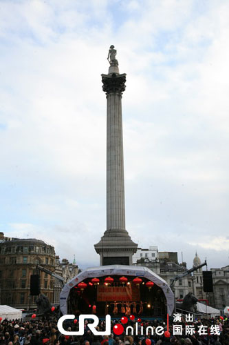 “文化中国·四海同春”民族歌舞艺术团把舞台搭在了伦敦市中心的特拉法加广场。(张哲/摄影)