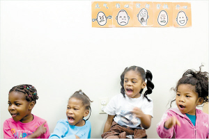 一群美国小学生在课堂上学习中文,身后是五种心情的中文表述。