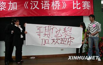 3月10日,在哥斯达黎加圣何塞的国立大学举行的首届“汉语桥”比赛上, 大学生董瑞(右一)和方思月(右二)展示书写的中国汉字 “哥斯达黎加欢迎你”。