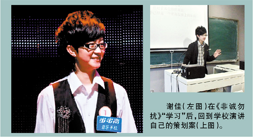 根据网友的爆料,本报记者查看了北京现代音乐研修学院的官网,赫然发现一则题为《我院学生深入江苏卫视学习娱乐节目策划》的新闻,主角正是谢佳。该新闻中说:“谢佳是我院艺术管理学院2008级学生,她的专业是演出项目管理;此次她参加《非诚勿扰》节目的主要目的是学习如何成功策划一档新型电视节目及如何管理好整个节目的录制工作来提高自己的专业修养……”
