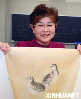 4月8日,在日本东京工学院大学孔子学院,学员石桥成子展示自己绘制的中国工笔画。学习中国画3年时间的石桥成子本人还开设了中国画教室,拥有53名日本学生。(新华网/季春鹏 摄)