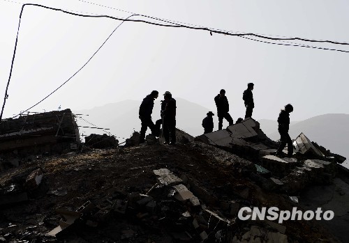 4月15日,青海玉树县胜利路口的废墟上,民众在断壁残垣上守望救援进程。目前青海省玉树州“4·14”地震造成的死亡人数已上升至589人,10万灾民需要需要转移安置。中新社发 廖攀 摄