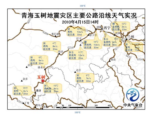据悉此次专报重点针对青海玉树地震灾区天气情况和气候背景进行预报和分析,主要包括震区最新天气实况、玉树地震灾区未来5天天气预报、道路交通气象预报、决策建议以及玉树地震灾区气候背景分析和气候趋势预测等内容。