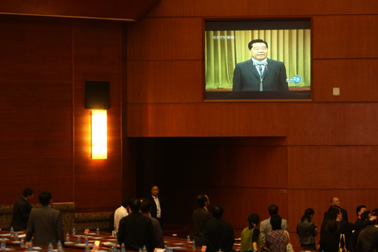 5月7日晚,参加“第五届世界华侨华人社团联谊大会”的代表观看中央电视台新闻联播关于大会的报道。
