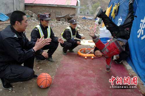 中新网青海玉树5月12日电 (郭静 田苗)玉树大地震使当地孩子们依赖的校园在顷刻间变成一片废墟,残酷的现实给孩子们脆弱的心灵上又蒙上了一层阴影。在当地的兰州特警队员利用休息间隙主动来到学校,和孩子们进行面对面、心贴心的交流,与他们架起心灵沟通的桥梁。针对孩子们的心理弱点,队员们极尽发挥各自的特长,调动孩子们的积极性,通过给他们讲故事,和他们做游戏,逐步唤醒孩子们对美好生活的憧憬。