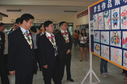 国侨办文化司副司长李民(中)、华文教育处处长邱立国(右)观看侨中组学生书画展