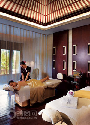 大堂所在地是一座高高在上的宫殿式建筑,檐角高挑,庄重有仪,进来后,一条长长的木廊道直通向光的尽头,皇家的气派表露无遗。整个酒店的设计灵感则来自北京颐和园的经典建筑设计,包括斜尖屋顶、深色实木、复杂细致的雕刻和马赛克镶嵌装饰等,精品购物店的外墙让人熟悉地看到天安门城楼的影子,而名为“雪阁”的雪茄吧看上去就像微缩的天坛。这是亚龙湾面积最大的酒店,空间足够开阔,除了主体建筑和附属设施外,33座备有私人管家及独立泳池的私家别墅散落在亚龙湾幽静的细白沙滩和红树林保护区之间,据说每座别墅都有露天日光浴平台,还有水天相接的无边际泳池,这种奢华而私密的家庭度假并不适合一个人来此的我。在去往房间的通道里,一样能感受得到酒店空间上的奢华:所有的房间都只靠一侧,走廊的另一侧是通透的玻璃大窗,风景不只属于阳台,走路的人也可以看到风景!