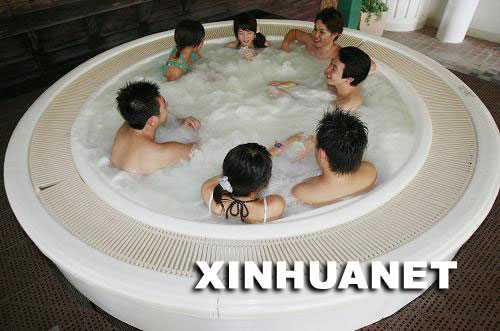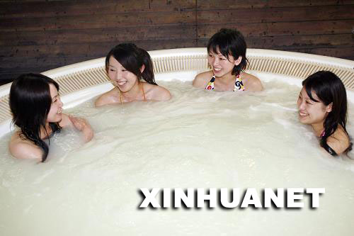 10月12日,几位游客在日本首都东京西南80公里处的温泉之乡箱根体验“豆奶温泉”。新华社记者 任正来 摄