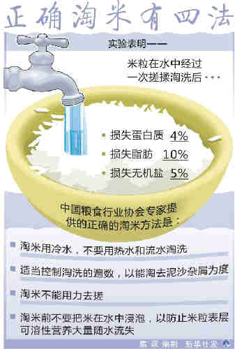 大米富含人体必需的营养素,是我国人民的主要粮食之一。用米做饭先要淘米,把夹杂在米粒中间的泥沙杂屑淘洗干净。但淘米不得其法,就容易使米粒表层的营养素在淘洗过程中随水流失。实验表明,米粒在水中经过一次搓揉淘洗后,所含蛋白质会损失4%,脂肪会损失10%,无机盐会损失5%。中国粮食行业协会的有关专家提供的正确的淘米方法是: