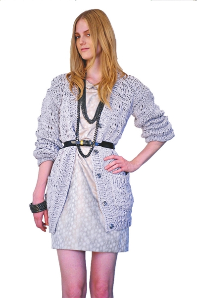 此外,将棒针针织与雪纺或起毛皮革等不同面料进行搭配,可让针织衫呈现全新的表情。由于棒针毛衣带给人本身已经很狂野了,所以在色彩的选择上以黑色、茶色和红色为主,虽说流行,但也有人一穿这种灰暗的颜色就显得老土,怎么办呢?这就要靠值得玩味的细节了。比如抽带、细皮条和大纽扣……(舒志娟)