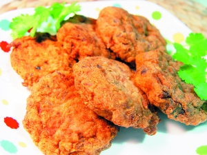 材料:鲮鱼滑(230克)、红萝卜(1/4根)、黄彩椒(1/4只)、葱(1根)、香炸粉(1杯)