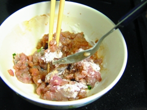 1 鲮鱼滑置入大碗中,加入腌料拌匀,用筷子顺一个方向打至起胶,腌制15分钟。