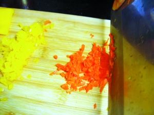 2 黄彩椒去蒂和籽,切成细末;红萝卜去皮,也切成细末;葱去头尾,切成葱末。