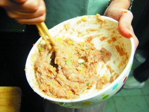 3 将红萝卜、黄彩椒和葱花倒入大碗中,用筷子搅拌均匀备用。