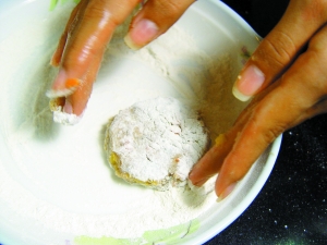 4 双手抹上油,取适量鲮鱼滑揉搓成团状,压成圆饼状,双面都沾上一层香炸粉。