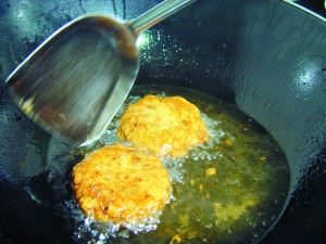 5 烧热1碗油,放入鲮鱼饼双面各煎30秒,改小火慢煎至呈金黄色。