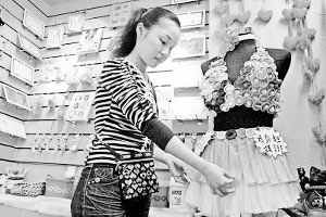 根据刘女士提供的线索,记者来到沙坪坝三峡广场这家卖安全套首饰品的小店。该店店面不大,货架上摆满了各类用安全套做成的饰品,有手机链、棒棒糖、钱包套、笔记本、获奖证书、刺绣护身符、喜糖等数十个品种。醒目位置还摆放着一个身上戴着各种安全套饰品的塑料模特。