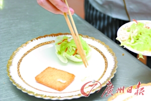 6. 用包心菜剪成小圆兜并放上配菜(或沙拉),然后把“翅虾”放在烤过的面包片上即可。 (文/吴婉虹 图/司徒健)