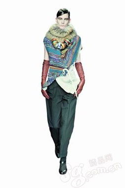 彩色针织、华丽皮草以及夸张彩色颈饰的综合运用之下,打造出令人过目不忘的寒冷高地民族印象。