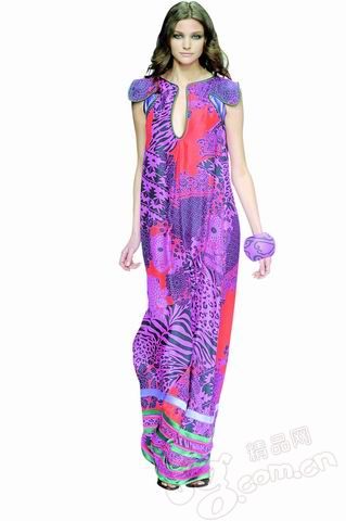 明艳的粉红裙身上密布着斑马纹、豹纹和各种部落图案,传达出强烈的异域民族风情,长及脚踝的裙身惹人眼球,同色系的超大手镯更有画龙点睛之感。