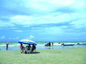 当蔚蓝的海水裹携着白色波涛徐徐涌上沙滩,银白的沙滩便一寸一寸后退,浪花在游人脚下追逐。林阴小道曲折宛延,椰树林独具风情。信步海堤,海天一色,白云朵朵,海帆点点,波涛滚滚,令人如入仙境,心旷神怡,流连忘返。