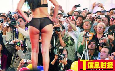 情趣内衣秀在性文化节会场中“人气”最旺,不少观众占据有利地形一饱眼福