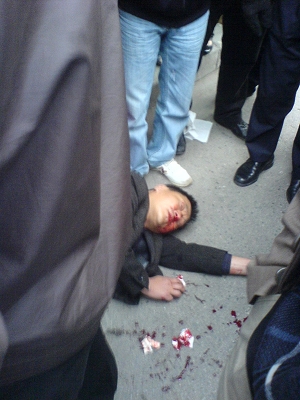 昨日下午3点40分,任先生一家三口在黄浦区城隍庙附近逛街时,因一位女店主质疑任先生损坏了店中的一只暖瓶,争辩中,任先生遭店主用钢制暖瓶猛砸面部,血流满面倒地昏迷不醒。