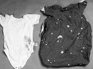法庭展示的Baby P曾经穿过的衣服,上面沾满血迹。