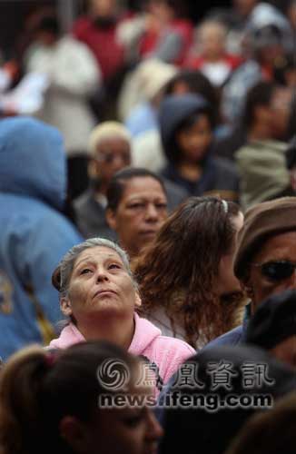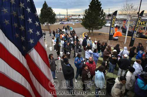 2008年11月25日,美国科罗拉多州丹佛市,人们在寒风中排队等待领取感恩节的免费火鸡和其他食物。丹佛市的慈善机构计划在感恩节之前向大约1200户有需要的困难家庭发放感恩节食物。
