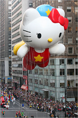 洛杉矶的小姑娘打扮成花季天使,和父母亲一起参加十一月下旬的感恩节欢庆活动。感恩节连日长假,是每年美国人最重要的娱乐购物节庆之一。07年美国纽约在当地时间22日举行了感恩节大游行,万人参加场面热烈。巨型卡通造型的气球吸引了很多人。总共有11个大气球加入游行,其中包括在天上飘的凯蒂猫,吸引现场所有人的目光,多达800名小丑和11支乐队,以及2000名拉拉队员和舞者,将整个游行气氛推向高潮。 一位纽约市民幽默的说:“我喜欢的是最后会出现的耶诞老人,因为这样我们可以赶快离开,然后回家开始吃火鸡!”